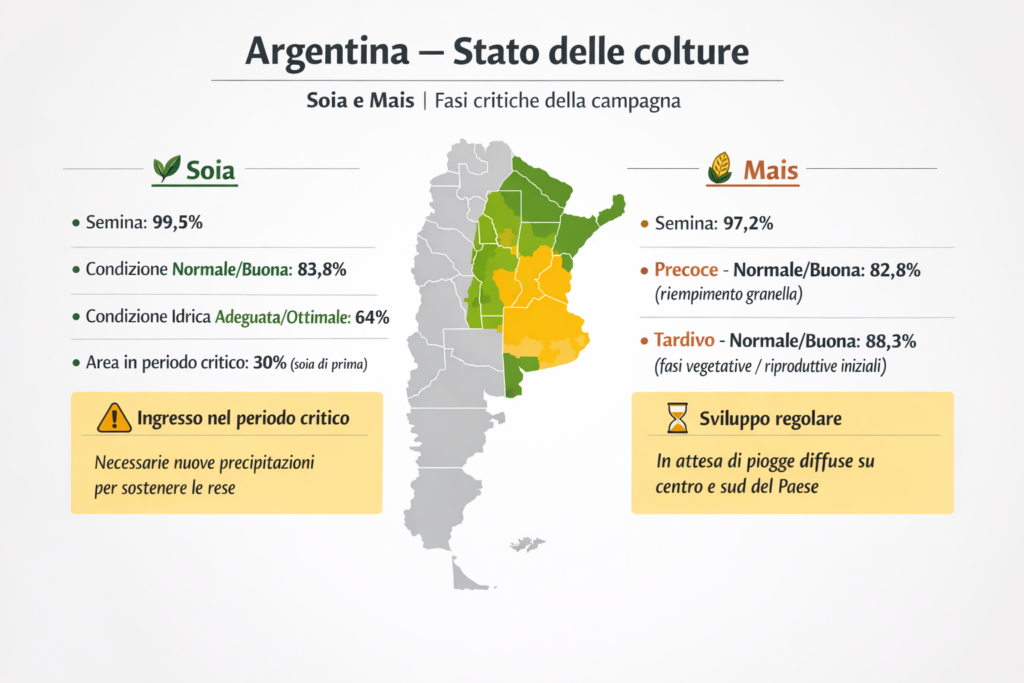 - 🌱🌽 Argentina sotto osservazione: soia e mais nelle fasi chiaveIn Argentina, l’attenzione del mercato resta concentrata sull’evoluzione delle condizioni delle colture, in una fase cruciale della campagna. 🔹 Soia Le semine sono ormai prossime alla conclusione e la maggior parte delle superfici presenta ancora una condizione complessivamente buona. Tuttavia, sia la condizione colturale sia quella idrica mostrano lievi segnali di peggioramento. Una quota crescente… Leggi tutto: 🌱🌽 Argentina sotto osservazione: soia e mais nelle fasi chiave
